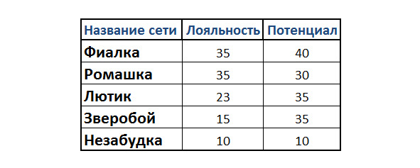 Довольно частый вопрос со стороны КАМов: как создать саму шкалу и правильно определить цену деления на каждой шкале? Разберём случай с нашими пятью «цветочными» героями. Сводим в одну таблицу уровень потенциала и лояльности (в баллах) для всех пяти сетей: