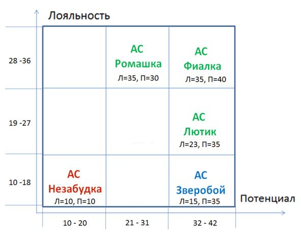 Максимальный уровень лояльности – 35 баллов, минимальный – 10. Так как у нас матрица содержит по 3 квадрата для каждого параметра, цена деления шкалы считается следующим образом: от максимума (35) надо отнять минимум (10) и поделить на 3. (35—10) /3, что даёт нам шаг примерно «8». Следовательно, первый квадрат в параметре «Лояльность»: от 10 (наименьшее значение) до 18 (10 +8 – как шаг на шкале), второй – от 19 до 27, третий – от 28 до 36.
