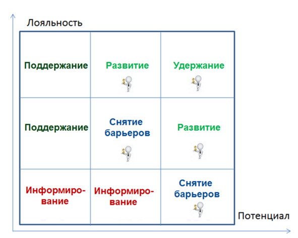 В зависимости от того, к какому квадрату относится клиент, в работе с ним применяется различная стратегия взаимодействия: