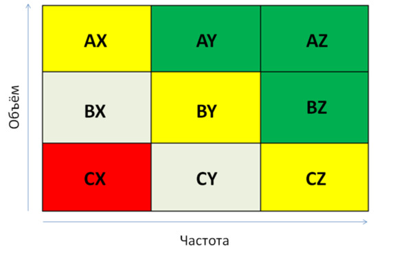 Такая классификация довольно проста и понятна – в соответствии с ней наиболее привлекательными являются те клиенты, которые помногу и часто покупают. Естественно, те партнёры, которые находятся в квадратах «AY-AZ-BZ», будут наиболее важными для компании. Потом – те, кто попадает в жёлтые квадраты. А вот на тех, кто и берёт мало, и делает это редко (красный квадрат) много времени тратить жалко.