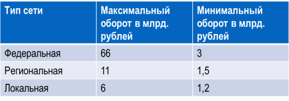 По данным, например, за 2018 год (такие данные будут и за последующие годы, только несколько позднее; пока же речь идёт о примере и принципе создания модели) общий товарооборот аптечных сетей находится примерно в таких диапазонах: