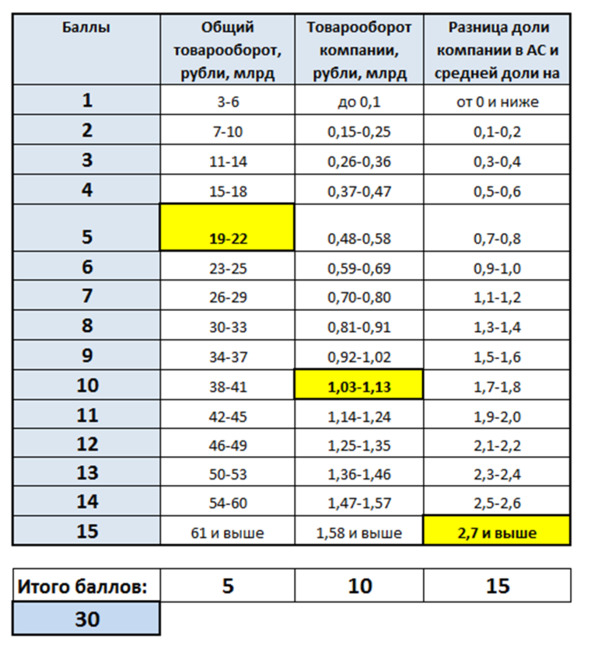 Например, если общий товарооборот сети находится в интервале «19—22» млрд. рублей в год, то данная сеть за этот оборот получает 5 баллов (из возможных 15 для «61 млрд. и выше»). Товарооборот компании в интервале «1,03—1,13» млрд. рублей в год даст ещё 10 баллов. Для небольших компаний интервалы собственного оборота могут быть изменены, общая сумма будет меньше, чем в моём приведённом примере.