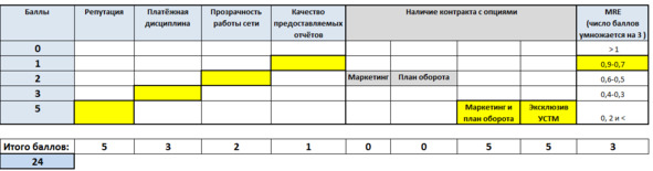 В моём примере сеть получает 24 балла: у неё отличная репутация на рынке, хорошая средняя платёжная дисциплина, не очень высокая прозрачность работы и плохие по качеству отчёты.