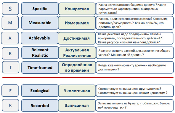 SMART – это методика развёрнутых ответов на вопросы, показывающих, насколько поставленная цель конкретна, измерима, достижима, реалистична и определена во времени. + ER: соответствующая духу компании и записанная на бумаге.
