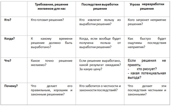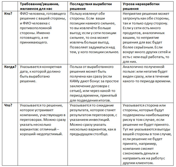 В чём смысл заполнения такой таблицы? В формализации того, что нужно помнить при подготовке к переговорам. Логика таблицы следующая: есть 3 варианта развития событий, такие как «решение, желаемое для нас», «последствия выработки решения» и «угрозы неразработки решения». По каждому из сценариев необходимо ответить на вопросы «кто?», «когда?», «что?» и «почему?» в определённом контексте, указанном в виде вопросов. Можно упростить себе задачу и не отвечать на вопрос «почему?», так как изначально подразумевается, что переговоры проводятся в соответствии с законами страны.