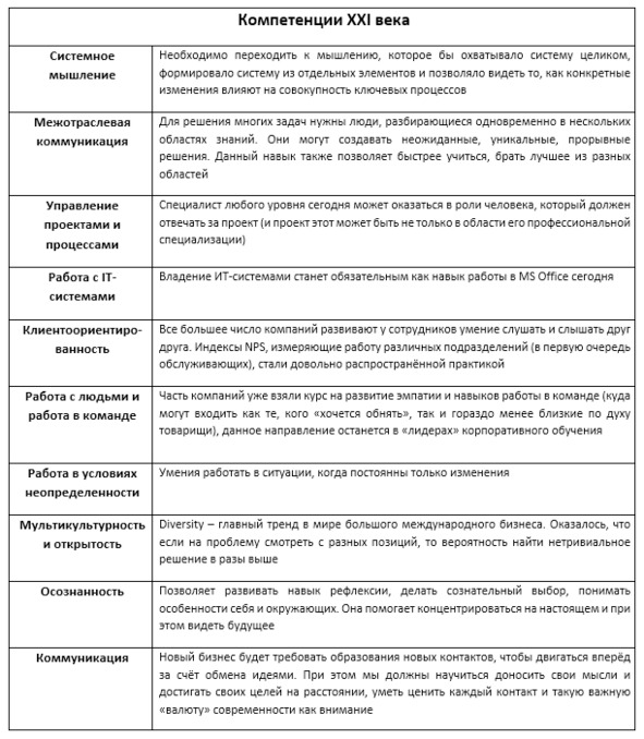 Важной темой являются так называемые «компетенции менеджеров XXI века». Ниже в таблице – 10 необходимых компетенций, появившихся в этом столетии и обязательных для наличия у менеджеров. [7]