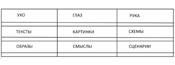Ухо – глаз – рука это три основных канала на входе. В коре больших полушарий головного мозга это самые большие области. Школа НЛП (неофициальная, но популярная психология) делит людей на аудиалов (ухо), визуалов (глаз) и кинестетиков (рука) – по тому, какой канал на входе самый сильный.