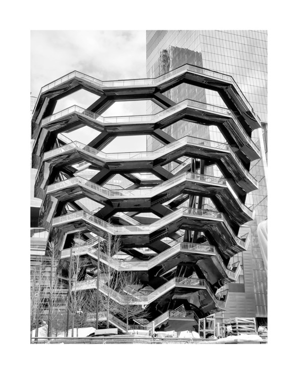 Наша прогулка больше напоминает ходьбу по переплетенному лабиринту с открытыми под небом площадками. Десятки лестничных пролетов создают видимые бесконечные лестницы. Считается, что это восьмиэтажная структура, а на самом деле здесь шестнадцать этажей. Повторяющиеся элементы делают геометрию сооружения необычной. На самом верху открывается потрясающий вид на новый район Хадсон-Ярдс и реку Гудзон. Если посмотреть сверху вниз и внутрь, то кажется, что скульптура похожа на огромный каменный цветок, а ты внутри него!