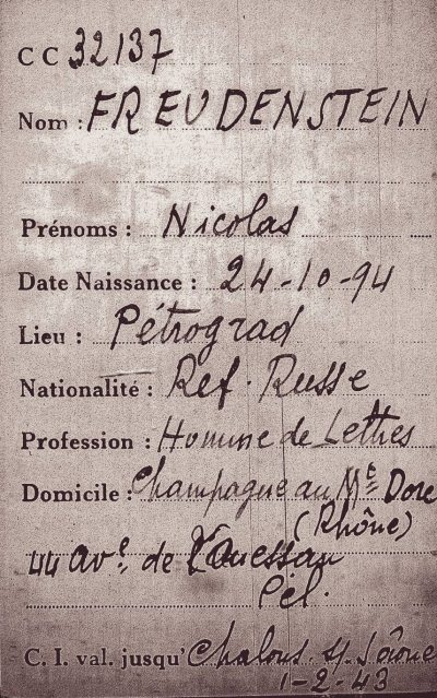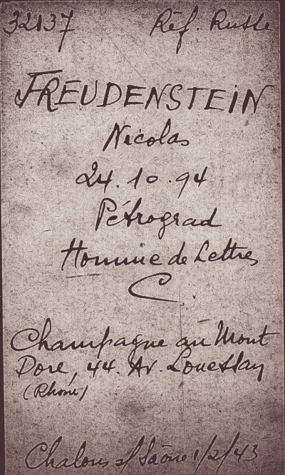 Регистрационная карточка Юрия Фельзена в концлагере Дранси. Archives Nationales, Paris, France. Fichier Drancy. № 32137. Freudenstein, Nicolas.