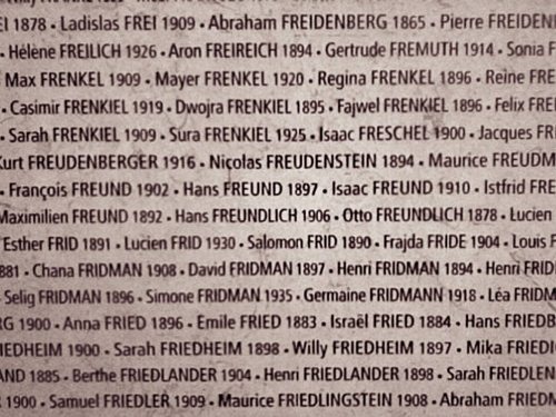 Имя Юрия Фельзена (Nicolas Freudenstein 1894) на мемориальной стене в честь евреев, депортированных из Франции в лагеря смерти. Memorial de la Shoah, Musee et Centre de documentation juive contemporaine, Paris, France.