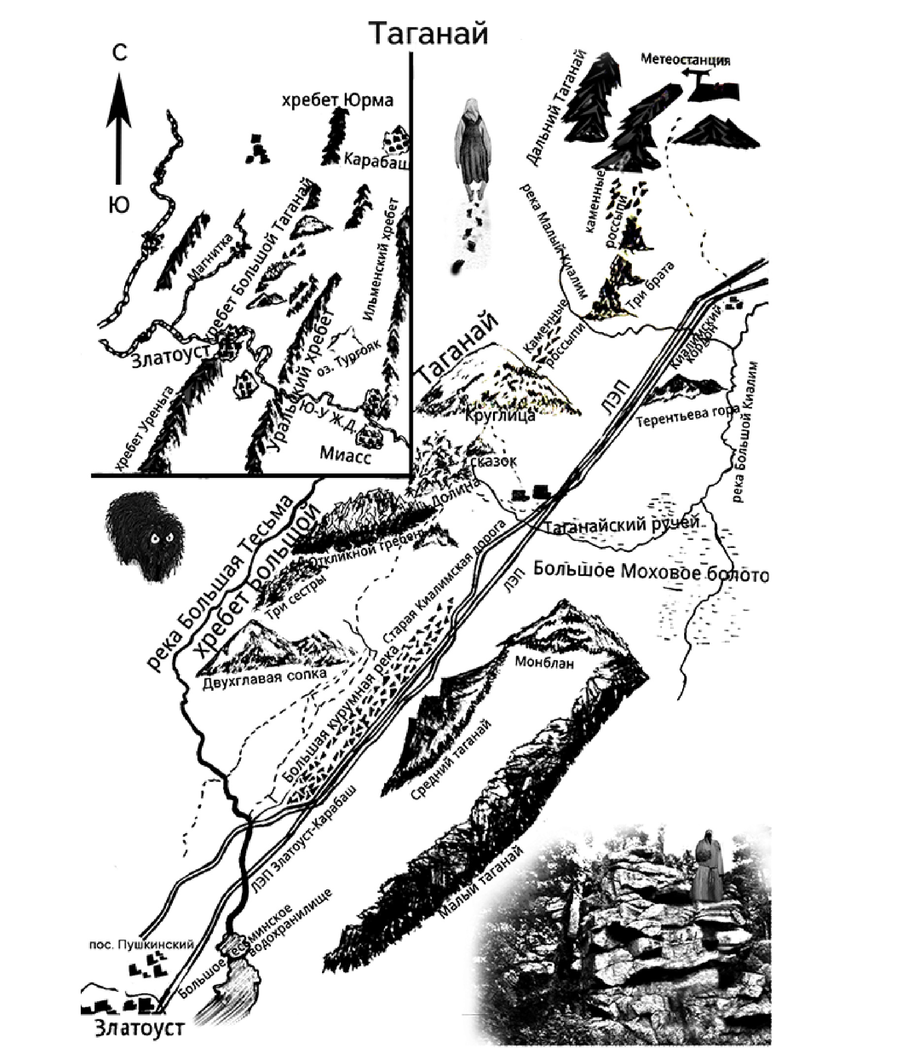 Но спускаться по ней никто не торопился, отряд наслаждался открывшимся видом на всю местность. Слева, окутанные легкой дымкой, вырастали могучие гребни Большого Таганайского хребта, чуть справа высилась цепь менее рослых гор – Средний Таганай, за ней виднелась еще одна гряда – Малый Таганай. А прямо перед туристами лежала заснеженная лесистая долина, посредине которой, извивалась просторная просека.