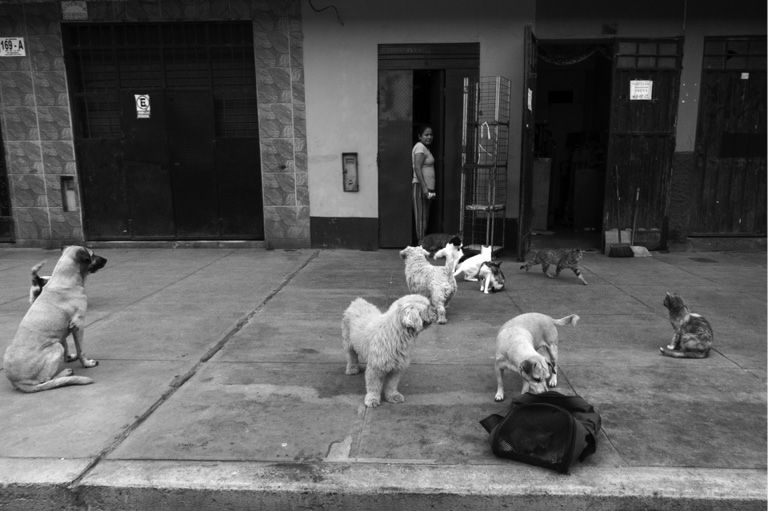 Pero estoy en La Victoria y estoy de suerte. He pinchado. La rueda delantera hace un chopchop que no me gusta nada, veo un grupo de indigentes que beben en la calle del mismo vaso, pienso acercarme pero ya me da no sé qué. En frente veo un grupo de gatos que hacen lo mismo y decido fotografiarlos a ellos. Resulta que están ahí porque Ana María cuida de ellos. Los recoge de la calle y los mima, a perros y gatos, y estos están bien ordenados, atentos a cada movimiento suyo. Me dice que no tiene pienso para darles de comer. Me enseña dos cachorros que ha recogido hoy mismo, que salen del desalojo de los puestos de la Cachina, otro mercado cuyo nombre también hace temblar. Vete a ver por esa calle y pon mi dirección, a ver si alguien me puede traer comida para los pequeños. «Claro que sí. 177-A de la avenida Aviación», replico. «Sí, sí, muchos vienen y hacen fotos y luego nada», se queja. «Te creo. 177-A de la avenida Aviación».