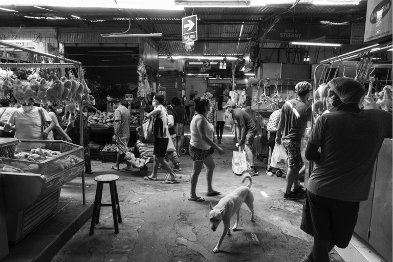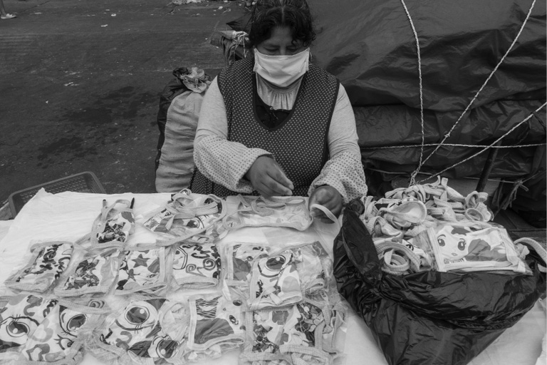 Luci está en La Parada. La Parada es un mercado callejero que está frente al emporio textil de Gamarra, la gran fábrica mundial de ropa bamba. Un mercadillo bien popular, que hace temblar cuando se lo menciona. Ocupa calles y calles transversales a la avenida Aviación, donde se venden, sobre todo, alimentos. La gente transita con máscaras, aunque algunos sin ellas. Le pregunto a Luci si ve que se toman en serio las medidas y me dice que más o menos. Es lo que veo. Para qué insistir. Junto a la reja de acceso hay una venta de mascarillas, a dos soles, más baratas. «No me hagas fotos, no me jodas». Esto de ir todos embozados mola.