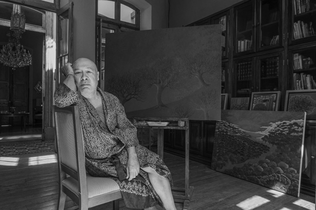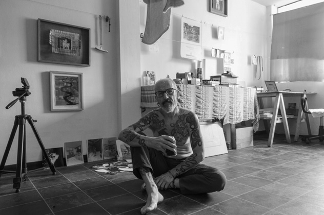 Cuco Morales con algunas de sus obras, en su estudio de Barranco.