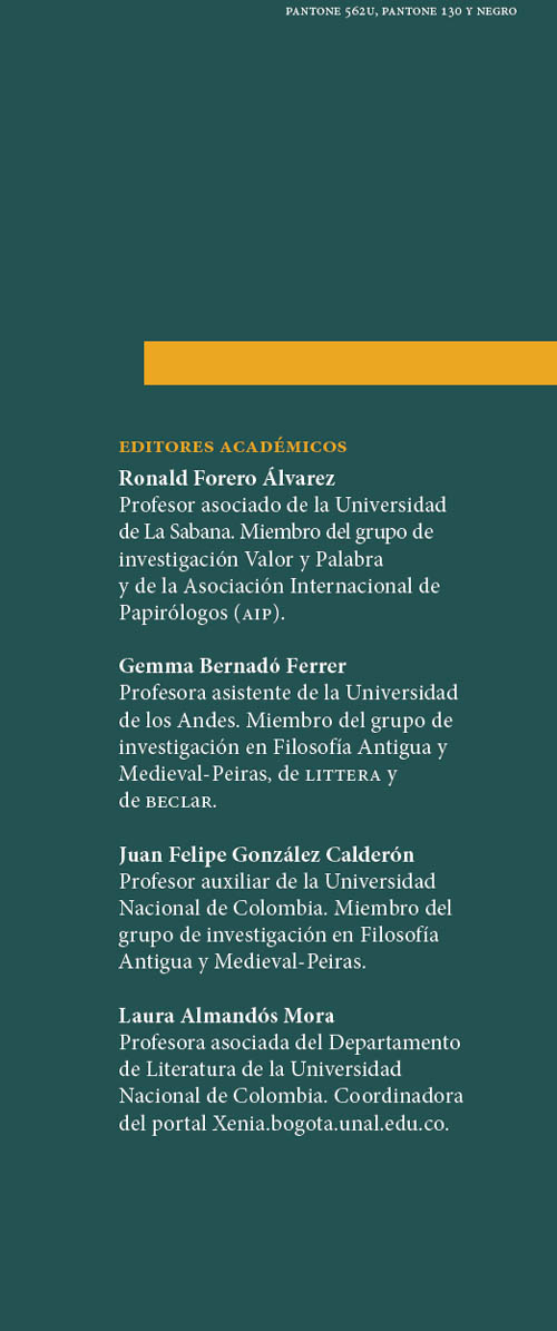 QUISIÉRAMOS AGRADECER A TODAS LAS PERSONAS QUE hicieron posible la publicación, desde los autores de los capítulos por el envío de sus contribuciones y su paciencia en el proceso de publicación hasta los miembros de los equipos editoriales de la Universidad de La Sabana, la Universidad Nacional de Colombia y la Universidad de los Andes. Asimismo, quisiéramos expresar a los profesores Jorge Enrique Rojas Otálora y David Konstan nuestro agradecimiento por su constante apoyo y motivación para la realización de este volumen colectivo, el cual nos permite tender un puente entre los clásicos y la actualidad, y de esta manera contribuir a la reflexión y al diálogo en torno a los problemas que nos rodean.