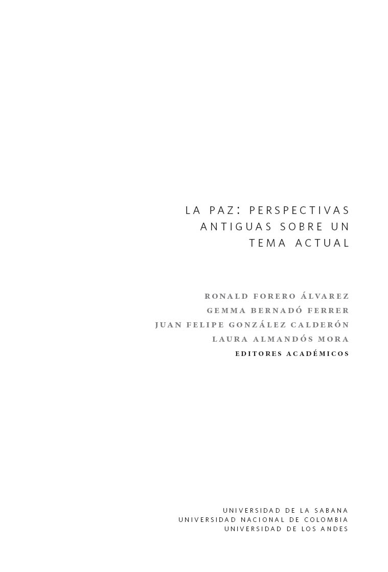 La paz: perspectivas antiguas sobre un tema actual / Ronald Forero Álvarez, Gemma Bernardó Ferrer, Juan Felipe González Calderón, Laura Almandós Mora (editores académicos). -- Chía: Universidad de La Sabana, Universidad Nacional de Colombia, Universidad de los Andes: 2020.