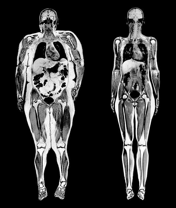 Думаете, жир скапливается только под кожей? Напрасно. На МРТ женщины весом в 114 кг, показанном в сравнении с МРТ женщины весом 54 кг, видны обширные отложения жира вокруг внутренних органов.