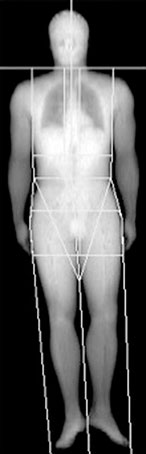 Двухэнергетическая рентгеновская абсорбциометрия (DEXA), стоимость сеанса которой около 50–100 долларов, стала моим излюбленным методом, так как она обеспечивает стабильность замера и дает ценную информацию помимо сведений о доле жира в организме. Аппарат GE Lunar Progidy, которым пользовался я, предназначен для определения плотности костей, во время которого он делит тело на зоны.