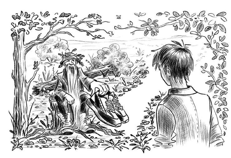 – Да ничего ценного, – говорит. – А только приходи сюда, вот к этой берёзе, каждый день, как темнеть начнёт. Зарубку тут сделай, словно сок хочешь взять. Вот тебе берестяной туесок-непроливайка для сока. Да смотри, не пропускай ни одного дня, месяц ходи. Пропустишь – худо будет. И не говори никому об этом! А кроссовки на – прямо сейчас бери. Что увидишь – не удивляйся. И каждый день на коре этой берёзы новую зарубку делай, как бы отмечайся.