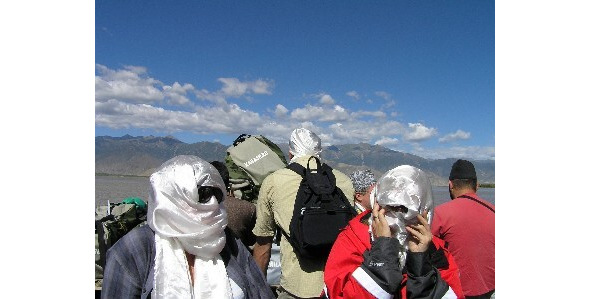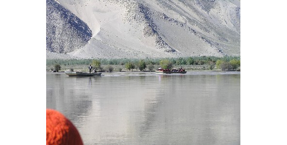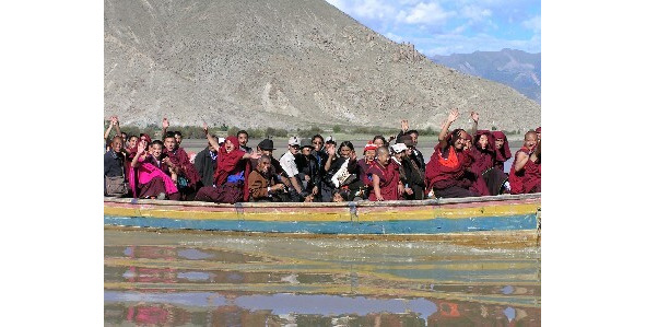 Для адаптации к высокогорью на этой высоте предстоит провести четверо суток. Ослепительно яркое солнце и горы, лишённые растительности, сразу же подчеркнули, что мы уже в другом мире. Другой воздух и другие запахи. Встреча на тибетской земле, знакомство с группой сопровождения (гид и водители джипов), традиционный белый шарф приветствия. Получение багажа, загрузка в джипы, распределение по машинам заняли не много времени. По воле случая мне достался «командирский» джип – в нём ехали гиды (тибетский и один из наших) и мы с Сергеем. Полтора часа пути по прекрасно асфальтированной дороге привели нас к переправе через реку Брахмапутра или по – тибетски Цангпо. Перегрузили багаж на гигантские лодки и, разместившись на сиденьях, отчалили от берега. Погода была изумительная, солнце палило нещадно. Кое-кто (в основном женщины) нашёл выход и в качестве защиты использовали подаренные белые шарфы, хорошо отражавшие солнечную радиацию. Ширина реки, наверное, километров пять или чуть более. Во всяком случае, переправа заняла столько же времени, сколько и дорога из аэропорта. Мягко говоря, до полной прозрачности воды в реке было далеко. Множество водоворотов и отмелей, за которые, иногда задевал гребной винт, изрядно уменьшали и без того не большую скорость. Но, тем не менее, дизель исправно тарахтел. Навстречу попадались такие же лодки с другого берега. Одна из них была заполнена монахами в красных одеждах, радушно приветствовавших нас.