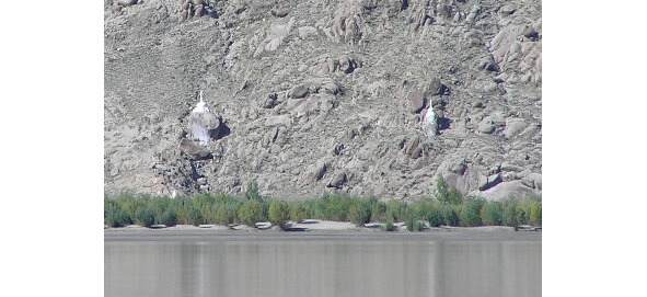На склонах гор противоположного берега хорошо заметны ступы, а также выходы интересных горных пород (группа камней, отличающихся формой от окружающего рельефа). Явно просматривалась закономерность: необычные образования и ступы присутствовали рядом друг с другом. Если предположить, что ступы строились не в любом месте, а, предположим, в местах выходов полей тонких энергий, то не исключено, что необычные скальные образования формируются под их воздействием.