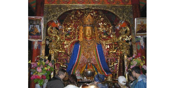 Вначале нас провели к площадке перед входом в верхнее помещение дворца, с рассказом о краткой его истории. Главным экскурсоводом по дворцу у нас был наш тибетский гид по имени Ту Тэн (или Чу Чэн). Много знает о Тибете вообще и о Буддизме в частности. Отвечает на любой заданный вопрос, не задумываясь. Переходя из одного зала в другой, гид рассказывал о хранящихся рукописях в библиотеке, о прахе всех Лам в истории Тибета, который находится в этом же дворце, о легендах и преданиях, попутно касаясь элементов философии буддизма. Кстати – во дворце свыше 400 помещений. И хорошо, что умно продумана система выходов с указательными знаками. Говорю так потому, что случилось мне отстать от группы, увлекшись фотографированием, и потребовалось напрячь воображение, чтобы выбраться наружу. Правда нет худа без добра – довелось побывать в комнатах, где группа не проходила и испытать влияние как положительной, так и отрицательной энергетики. Ощущение такое будто тебя причёсывают гребешком либо по шерсти, либо против. Минут через 15 блуждания выбрался таки на свет божий (кстати внутри монастыря цвета в основном красные и бардовые, что в общем то слегка давит на психику), вздохнув полной грудью. По пути попадалось много туристических групп в разных помещениях большинство из которых китайские, хотя были и англоязычные. Спустившись вниз, дождался возвращения всей нашей группы (кое кто вышел раньше – не выдержали энергетику), посетив близлежащие магазины. Впервые увидел серебряные и позолоченные статуэтки Будды. Очень тонкая и красивая работа. Цена, конечно, соответствующая. От ланча большинство отказалось – то ли от впечатлений, то ли от симптомов горной болезни, но решили ехать сразу же в летнюю резиденцию Далай Ламы – Норбулингка.