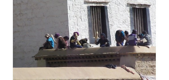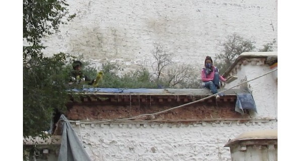 Как обычно, при повторном посещении любых достопримечательностей, начинаешь замечать ранее не замеченные в поле зрения факты – так случилось и на этот раз: впервые обратил внимание на людей, потукивающих деревянными лопатками по обрабатываемой поверхности (в данном случае по гребню стены), да ещё при этом напевая песни. Завтра в Дрепунге увидим как этим занимается целый хор на крыше монастыря.