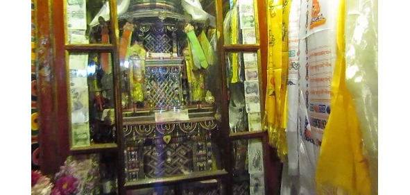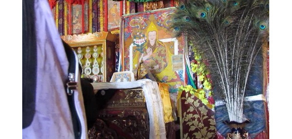 Выше на среднем кадре интересное изображение фигуры из облаков на фоне горного склона и козырька монастыря. Местные монахи усматривают в фигуре изображение Падмасамбхавы.