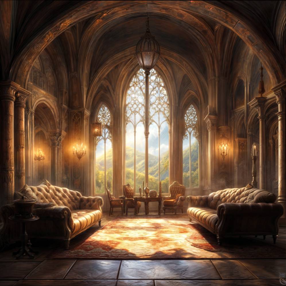 Мы осмотрелись. Здесь всё казалось нетронутым, будто хозяева спешно покинули замок, ничего не взяв с собой. Старинные родовые портреты висели на стенах. Перед огромным камином стояли мягкие, покрывшиеся пылью диваны. Рядом со свечами на каменном столике лежали книги, словно их только недавно читали. На полу валялась оброненная чашка, что говорило о том, что все-таки здесь что-то произошло. На каменном полу лежал мягкий ковер. Из высоких оконных арок, украшенных ажурными узорами, лился яркий солнечный свет. Лестница под куполообразным потолком вела на следующий этаж.