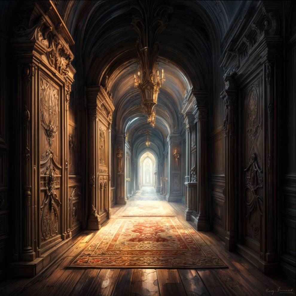Длинный коридор, состоящий из многочисленных резных арок, вёл вперёд и заканчивался широким оконным проемом. Каждая арка была отделена старинными светильниками, спускающими с потолка. Пол был устлан старинным меркатурским ковром. Вдоль коридора располагались украшенные резным орнаментом деревянные двери, ведущие в жилые комнаты.