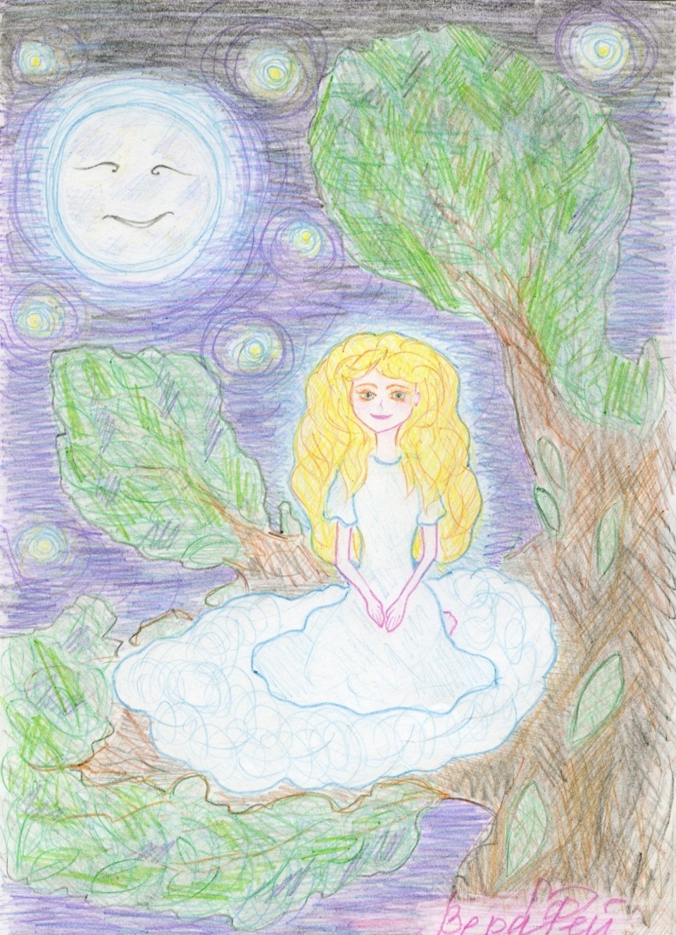 Над волшебным полем незабудок взошла луна. Вокруг цветов кружились светлячки, похожие на маленькие звёзды. В его центре стоял дуб. Луна взглянула на пушистую листву огромного дерева, в которой спала белокурая девушка. Открыв глаза, она поднялась и посмотрела по сторонам.