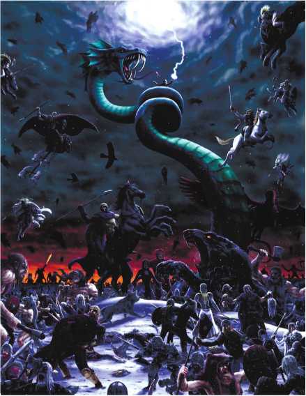 По легенде, в канун Рагнарека змей Ермунганд – сын бога Локи – освободится от своего хвоста и, поднявшись из океана, отравит небосвод. В этот же день мрак накроет землю, поскольку волк Сколл проглотит Солнце, а его брат Хати – Луну. Затем волк Фенрир растерзает бога Одина, а его сын Видар разорвет пасть Фенриру.
