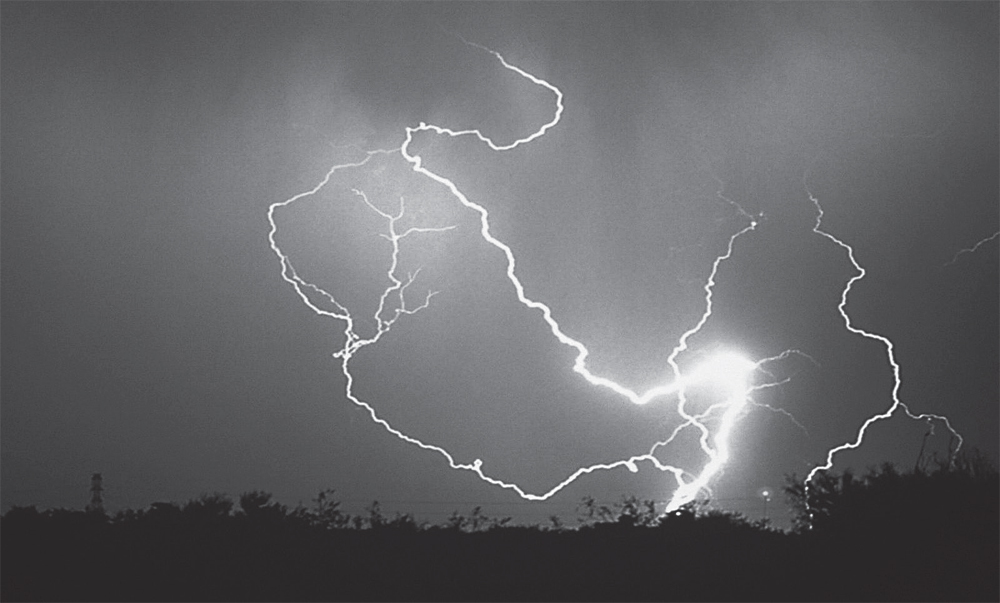 Вблизи поверхности земли сила тяжести молнии уравновешивается действием электрического поля от зарядившейся в грозу поверхности почвы. В таком взвешенном состоянии движение молнии зависит либо от воздушных потоков, либо от небольших изменений приземного электрического поля. Именно в этом состоит причина необычности ее поведения. Дело в том, что мы не имеем органов, которые реагировали бы на напряженность электрического поля. Во время грозы оно может возрасти вокруг нас в тысячи раз, и тем не менее мы этого не ощутим. Поэтому в повседневной жизни мы не знаем, как меняется электрическое поле вокруг нас, и, в отличие от поля тяжести, не привыкли считаться с ним как с возможной причиной, определяющей движение тел.