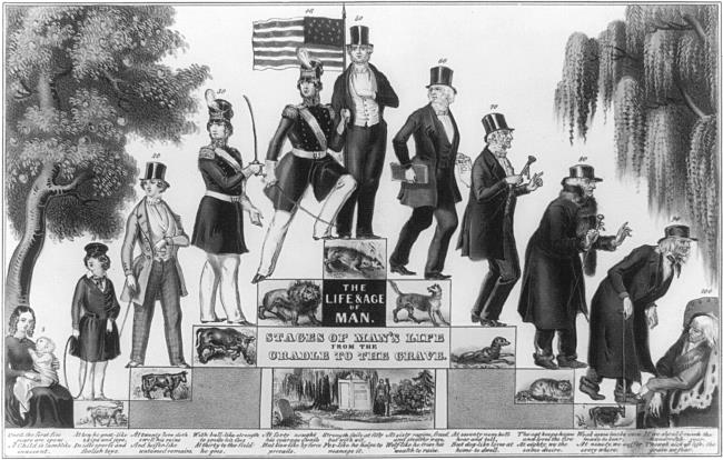 Основной визуальной метафорой этого образа жизни была лестница, ведущая вверх и вниз. Ожидалось, что люди будут подниматься в раннем возрасте, достигать пика в среднем возрасте, а затем медленно спускаться. У мужчин и женщин были свои собственные лестницы, но общая форма была все той же: дети играют; те, кто в расцвете сил, работают; старые ковыляют. Поразительно то, что, в отличие от более поздних парадигм, здесь средний возраст – это вершина.