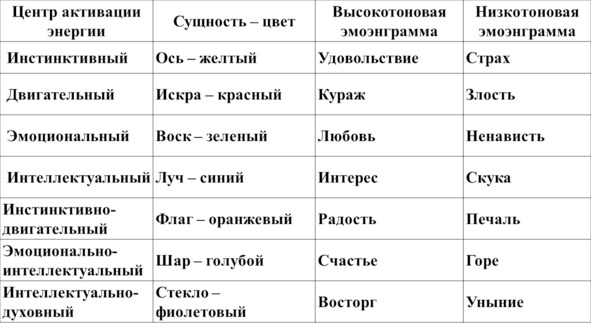 Таб. 2. Эмоэнграммы по центрам активации энергии, сущностям и тонам