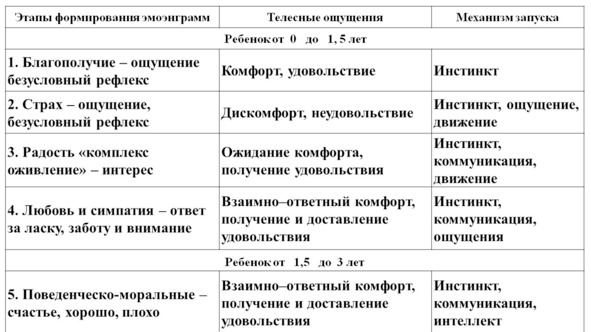Таб. 3 (часть 1). Этапы и механизмы формирования эмоэнграмм с рождения до 3 лет