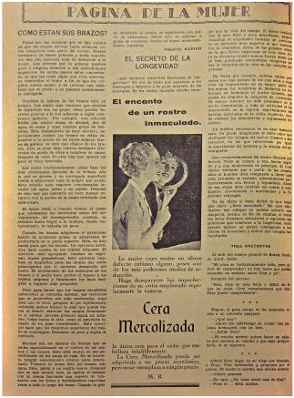La figura 16 hace parte de algunas secciones que circulaban en revistas como Cromos, Estampa y Mundo al día, en donde se hacía referencia directamente a las mujeres. El texto de esta sección presenta algunas recomendaciones para que las mujeres pudieran ser más bellas y aceptadas socialmente, para lo cual establece una serie de factores que les permitirán alcanzar la belleza y, al mismo tiempo, la longevidad.