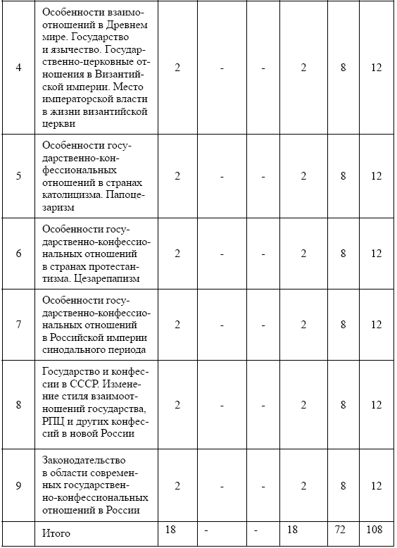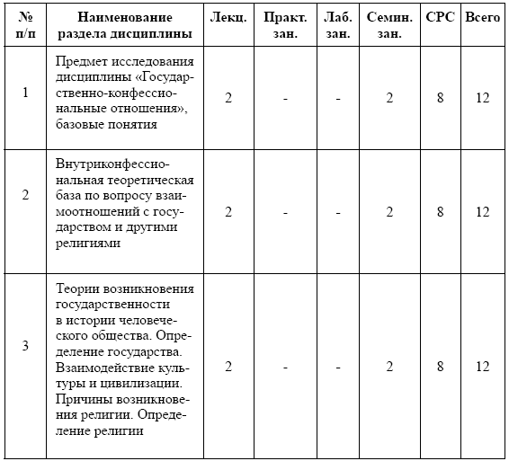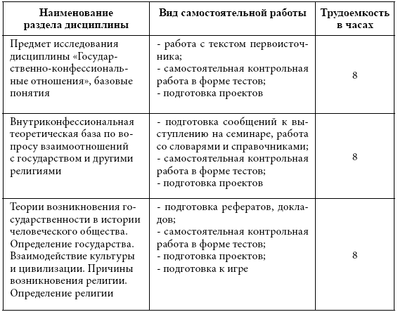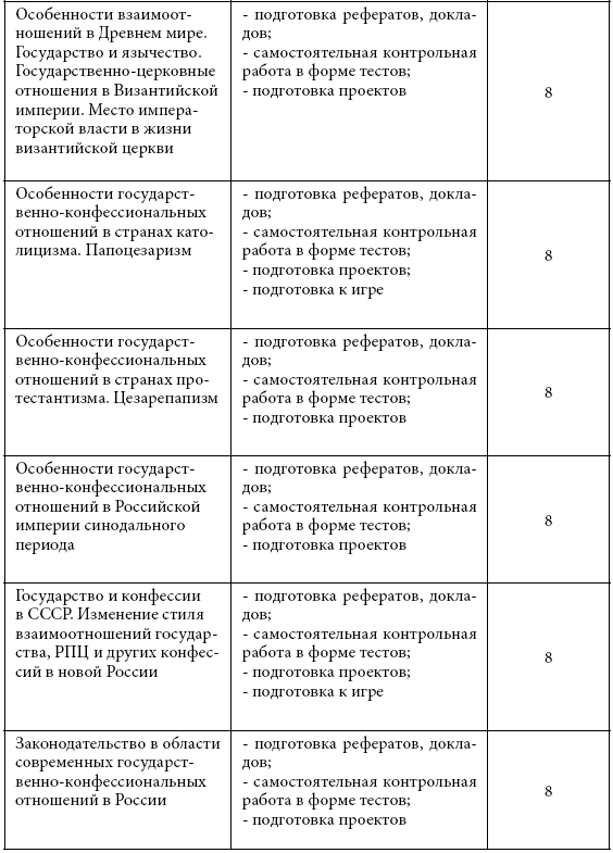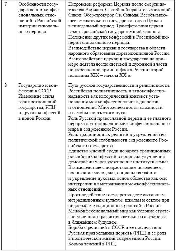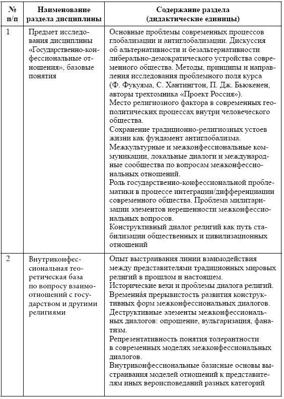 2. Место дисциплины в структуре ООП. Дисциплина «Государственно-конфессиональные отношения» является дисциплиной по выбору вариативной части гуманитарно-социального и экономического цикла (Б.1.В.ДВ.1.) и адресована студентам бакалавриата, обучающимся по направлению «Педагогическое образование». Она призвана способствовать углублению знаний студентов в области исследований культуры и расширению их аналитических возможностей в освоении основной образовательной программы («История и методология изучения культуры», «Современные исследования культуры в России», «Исследования культуры в современном мире» и др.). Данная дисциплина содействует формированию и усилению исследовательских компетенций, а также экспертных навыков, выводящих студентов в область практической деятельности и тем самым соединяющих теоретическую и прикладную области культурологии. Курс «Государственно-конфессиональные отношения» открывает для педагогов возможность системно-теоретического постижения социальной природы культуры, ее процессуальных, организационных и творческих форм в историческом контексте возникновения и развития, создавая базу для междисциплинарных исследований феноменов культуры, рассматриваемых в рамках других гуманитарных дисциплин. Результирующим качеством в реализации данной образовательной программы является формирование у студентов-педагогов модели понимания культурных процессов и явлений в социологическом горизонте знания, ориентированного на гуманитарную экспертизу и проектирование современных культурных практик.