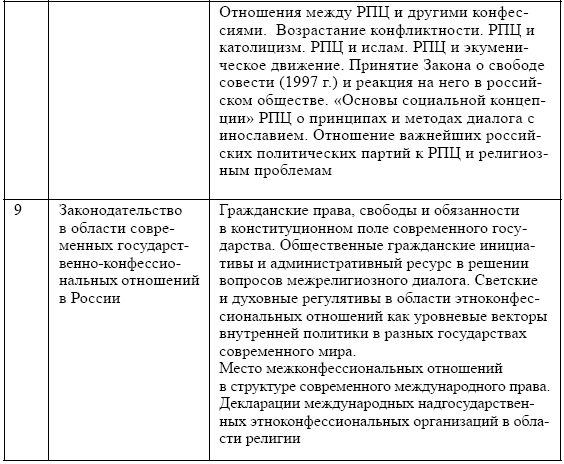• «Законодательство в области современных межконфессиональных отношений»;