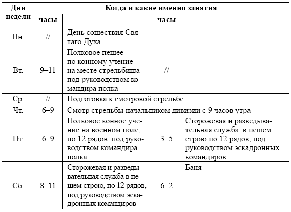 Как генерал-инспектор кавалерии великий князь Николай Николаевич Старший интересовался и расписанием занятий в армейских полках. Например: