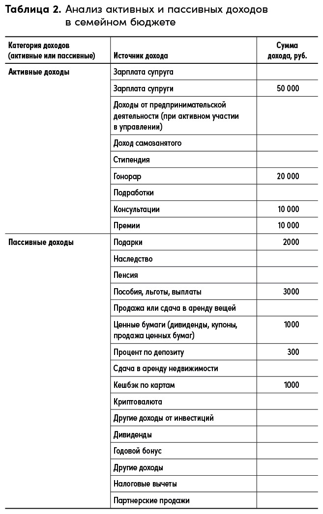 ЗаданиеВ табл. 2 приведен пример анализа соотношения активных и пассивных доходов одной семьи. Проанализируйте свои доходы по аналогии.
