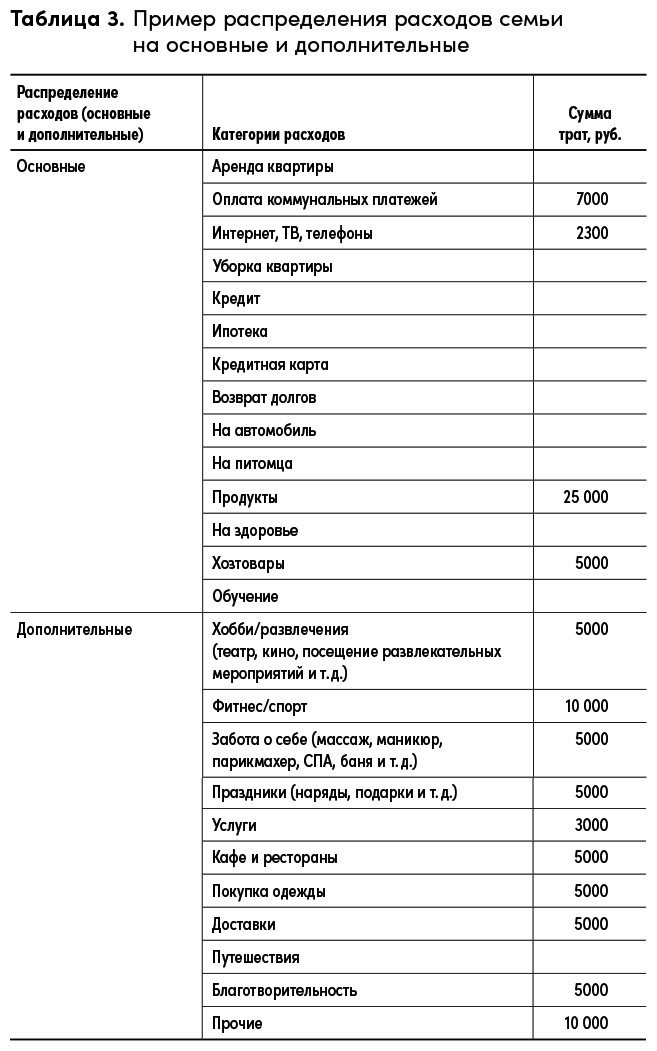 ЗаданиеПроанализируйте расходы своей семьи, используя приведенный в табл. 3 пример. Какие расходы вы бы отнесли к основным, а какие – к дополнительным?