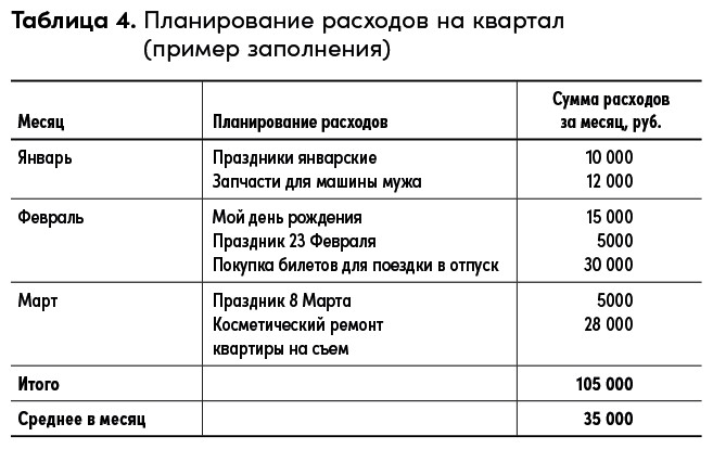 Ниже в табл. 4 приведен пример расходов, запланированных на квартал. Вы можете скачать на сайте такую же таблицу для своей семьи, отметив планы на три месяца или на год. Таблицу можно распечатать и повесить на видное место, чтобы все члены семьи могли вносить в нее свои будущие расходы.