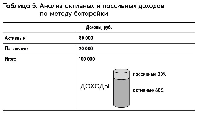 Уровень заряда батарейки с точки зрения доходов зависит от соотношения пассивных и активных источников прибыли. Откуда вам поступают деньги? Какая доля поступлений не требует вашего непосредственного участия? Чем больше ваш пассивный доход (рента от сдачи недвижимости в аренду, дивиденды по ценным бумагам, проценты по банковскому вкладу и т. п.), тем лучше ваша финансовая ситуация, тем выше заряд вашей батарейки.