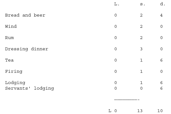 Sunday, July 19. – This morning early I summoned Mrs. Francis, in order to pay her the preceding day's account. As I could recollect only two or three articles I thought there was no necessity of pen and ink. In a single instance only we had exceeded what the law allows gratis to a foot-soldier on his march, viz., vinegar, salt, etc., and dressing his meat. I found, however, I was mistaken in my calculation; for when the good woman attended with her bill it contained as follows: —
