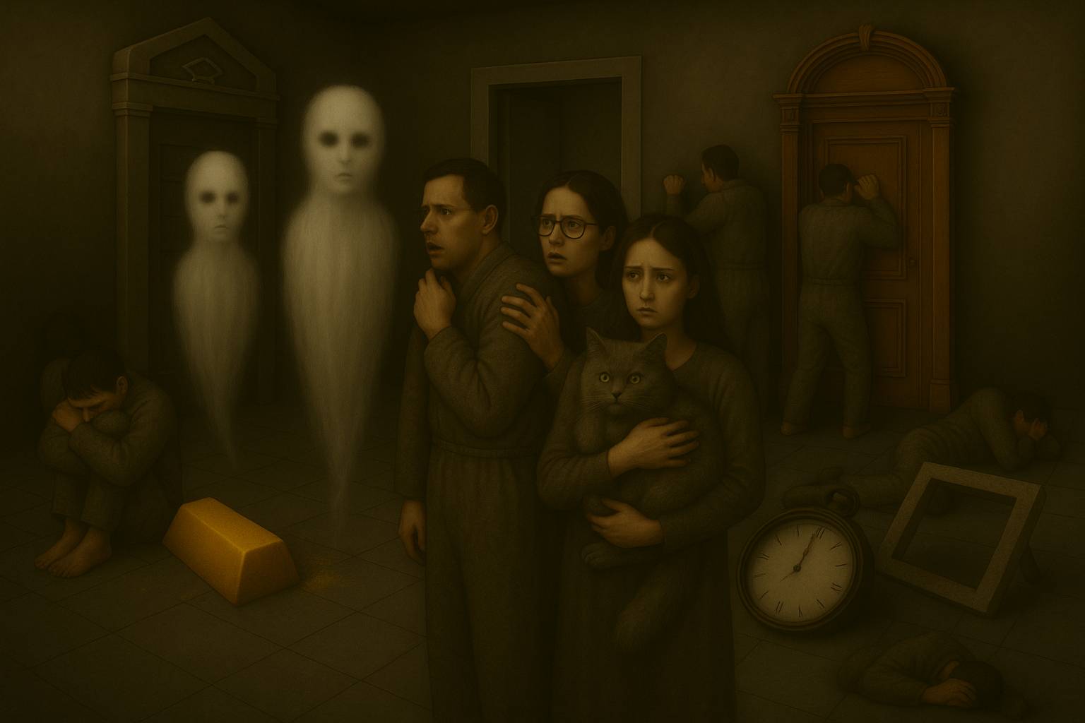 И вот тогда, в этой напряженной, звенящей пустоте, без вспышки, без малейшего предупреждения, прямо из ничего начали формироваться Они. Неясные сначала, но быстро уплотняющиеся силуэты – несколько фигур. Они не отбрасывали теней. Скудный свет потолочных ламп словно обтекал их, не находя поверхности, за которую мог бы зацепиться, создавая эффект дрожащего воздуха, как над раскаленной дорогой. Белые. Фигуры не выглядели цельными или твердыми; их контуры подрагивали, а сами они казались то более плотными, то почти полупрозрачными, словно состояли из клубящегося тумана. Будто это была материя привидений, тревожная и потусторонняя, лишь частично обретшая форму.