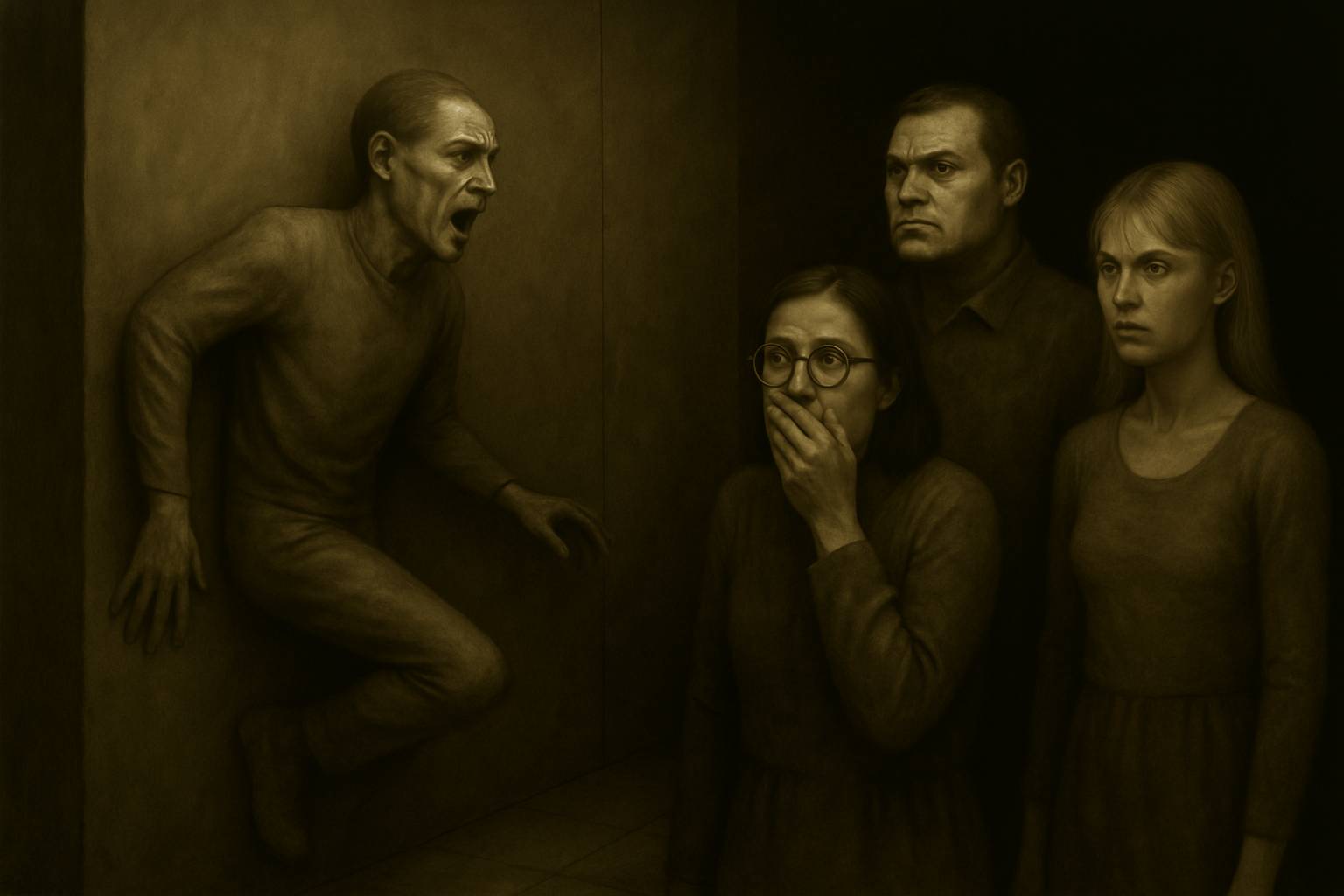 «Ошибка… ошибка при перемещении?» – выдохнул кто-то рядом со мной. Эта мысль – о чудовищном сбое телепортации – была первой, что обожгла разум. Степан, шагнувший ближе других, осторожно протянул руку и коснулся выступающей из стены щеки. Его лицо мгновенно исказилось недоумением. «Твердое… как камень, – глухо произнес он, отдергивая руку. – Холодное». Ободренные его примером и подталкиваемые жутким любопытством, еще несколько человек дотронулись до видимых частей «вмурованного». Ощущение было одинаковым у всех: то, что с идеальной точностью имитировало человеческую кожу, на ощупь оказалось каким-то плотным, совершенно неживым материалом – ни тепла, ни упругости, лишь холодная, гладкая поверхность.