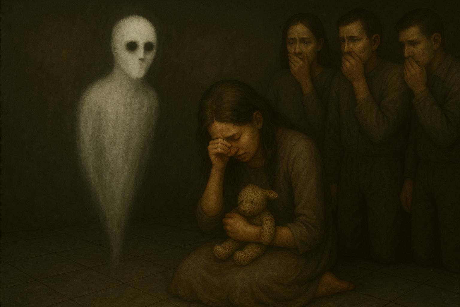 Голова – гладкий шар. Лицо – лишь намек: темные впадины вместо глаз, абсолютно лишенные выражения, крохотный бугорок носа. Рта не было. Ниже – длинное, бесформенное тело без рук и ног. Оно тихо колыхалось, как ветхий саван на призрачном сквозняке, хотя воздух в комнате застыл неподвижно. От них веяло чем-то древним, нечеловеческим и оттого абсолютно чуждым.