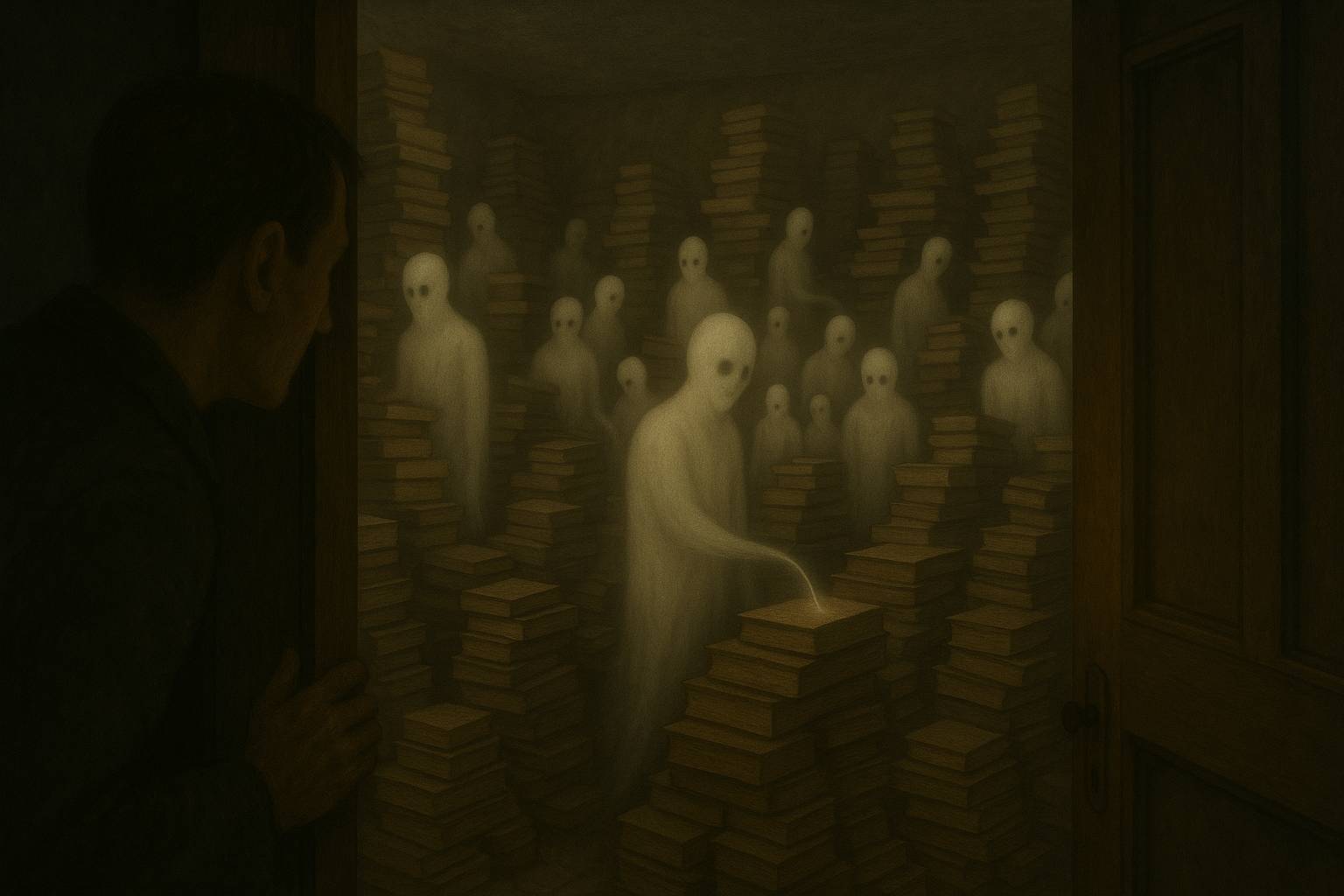 Не сговариваясь, мы начали таскать книги. Любые. От древних фолиантов в потрескавшихся кожаных переплетах до дешевых детективов в мягких обложках. Много часов. Пыль, затхлый запах старых страниц, монотонная работа – все это притупляло чувства. В какой-то момент, проходя мимо очередного дверного проема, ведущего в комнату, заваленную фолиантами, я замер. Боковым зрением уловил странное движение в глубине помещения – нечеткий призрачный силуэт, на мгновение перекрывший тусклый свет единственной лампы, и тут же истаявший. Словно кто-то очень высокий и тонкий скользнул за стеллаж. «Степан, – позвал я шепотом. Он как раз выносил тяжелую охапку томов из соседней комнаты. – Ты видел? Там, кажется, кто-то был». Степан смерил меня тяжелым взглядом поверх книг. «Кто там может быть, кроме нас, таких же бедолаг? – проворчал он, тяжело дыша. – Тебе от усталости уже черти мерещатся. Работай давай, не отвлекайся. Чем быстрее закончим эту дурь, тем лучше». Он прошел мимо, явно не собираясь проверять. Я еще раз неуверенно заглянул в комнату. Пусто. Может, и правда, показалось от переутомления? Но неприятный осадок остался. Словно за нами действительно наблюдали из теней этого бесконечного лабиринта.