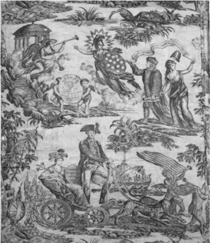 Полог сделан в Великобритании, но рассчитан на американского потребителя. Вашингтон едет в триумфальной колеснице. Франклин в сопровождении богини с фригийским колпаком – символом свободы – идет к храму Славы.